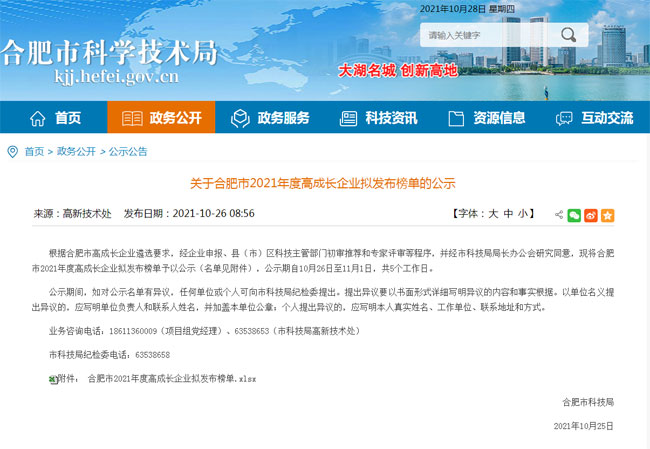 根據合肥市高成長企業遴選要求,經企業申報、縣(市)區科技主管部門初審推薦和專家評審,并經市科技局局長辦公會研究同意,安徽世綠環保科技有限公司成功入選合肥市2021年度高成長種子企業,公示如下: